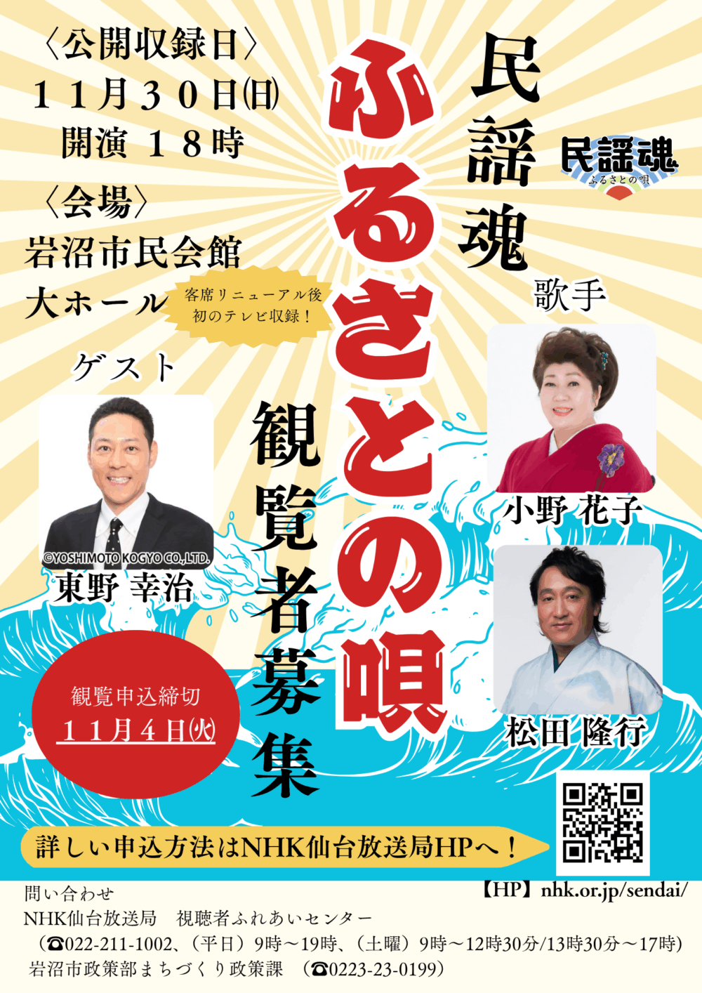 - NHK仙台放送局ホームページ内の専用申込フォームから申し込み(【HP】nhk.or.jp/sendai/)